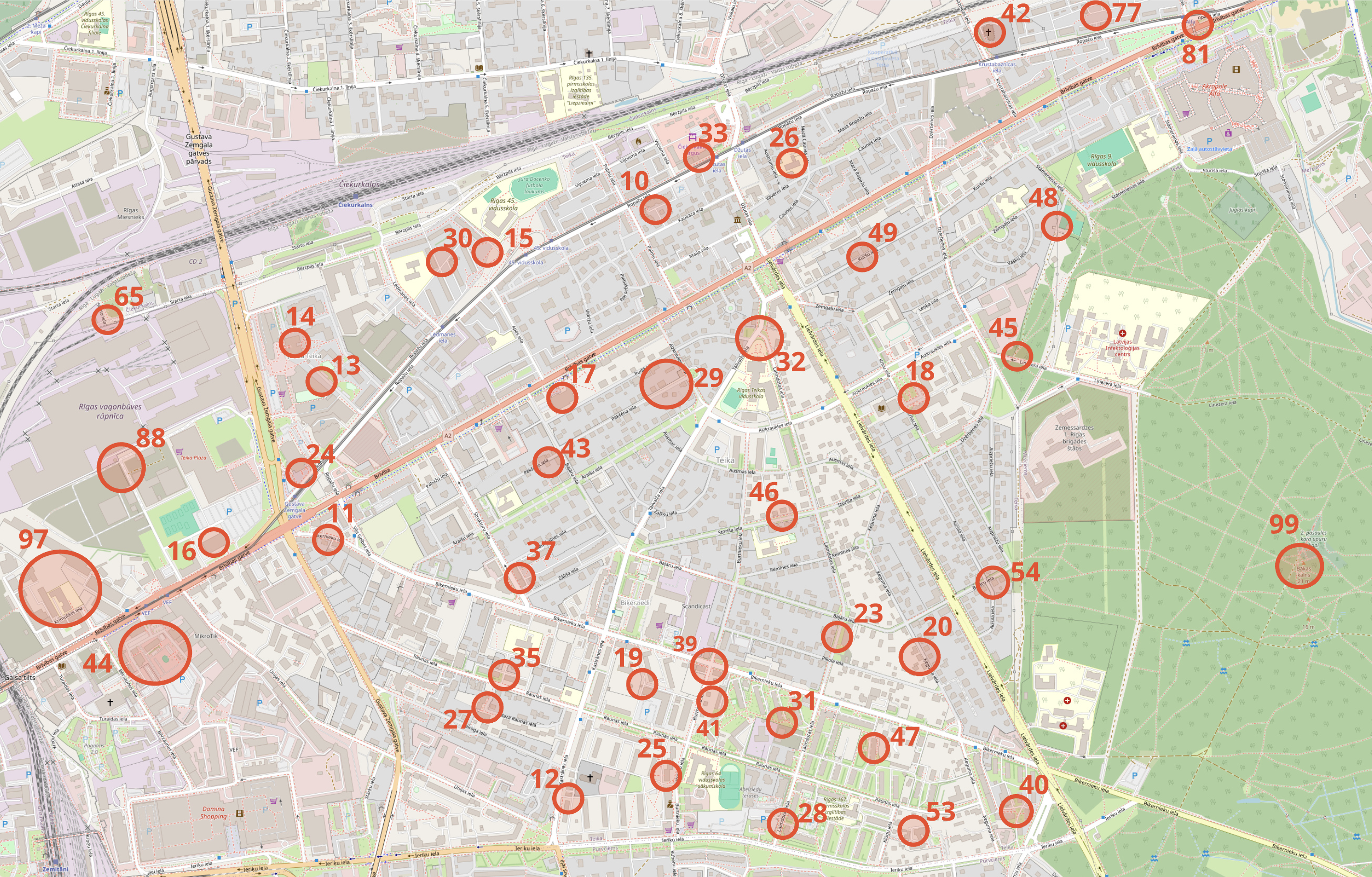 Zemāk ir redzama karte ar 42 punktiem. Katram punktam ir klāt numurs, pēc tā var noteikt punkta vērtību – punkta vērtība ir punkta pirmais cipars: piemēram, punkts “65” ir 6p vērts, savukārt punkts “17” ir 1p vērtībā.